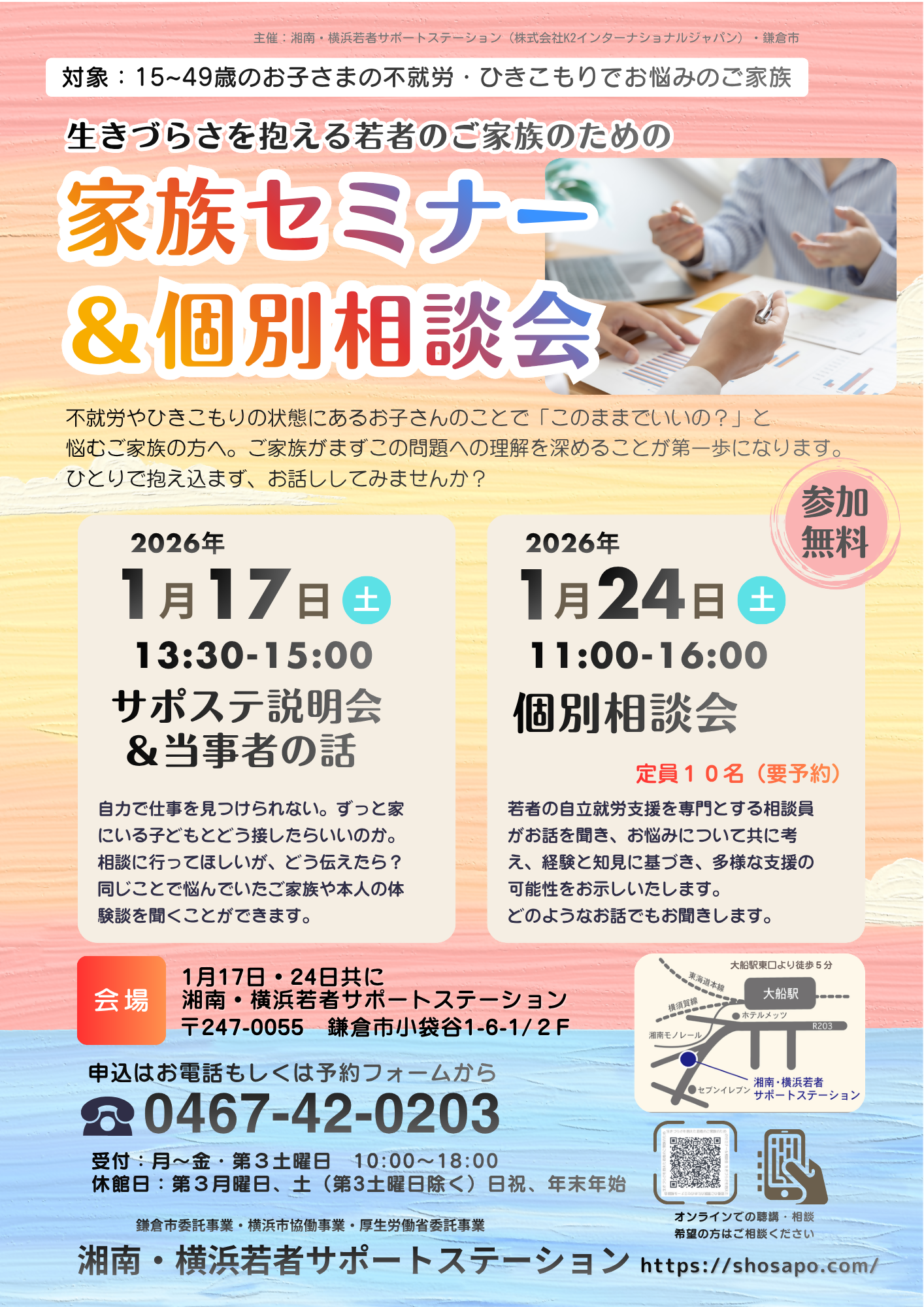 働く事や自立に不安や悩みを持っている方の為の相談室「湘南・横浜若者サポートステーション( 外部サイトへリンク )」が、15歳から49歳までの働くことや自立を目指している方とそのご家族のためのセミナーと相談会を開催します。