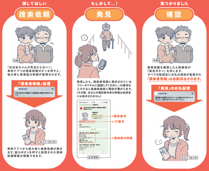 住民の皆さんにみまもりあいアプリを利用してもらい、利用者同士がアプリ上で行方不明者の情報を共有し、発見した場合に捜索依頼者へ連絡できるシステムで、住民同士が主体的に見守り合える互助のまちづくりを目指すプロジェクトです。