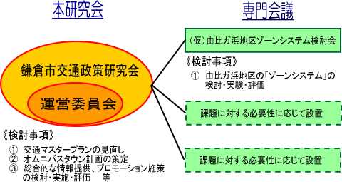 そこで市は、これらのことを総合的に勘案し、平成14年10月1日に「鎌倉市交通政策研究会(以下、「研究会」という。)」を発足させ、鎌倉地域地区交通計画の推進、公共交通機関の輸送力向上や利用の促進、交通マスタープランの見直し等を行うこととしました。