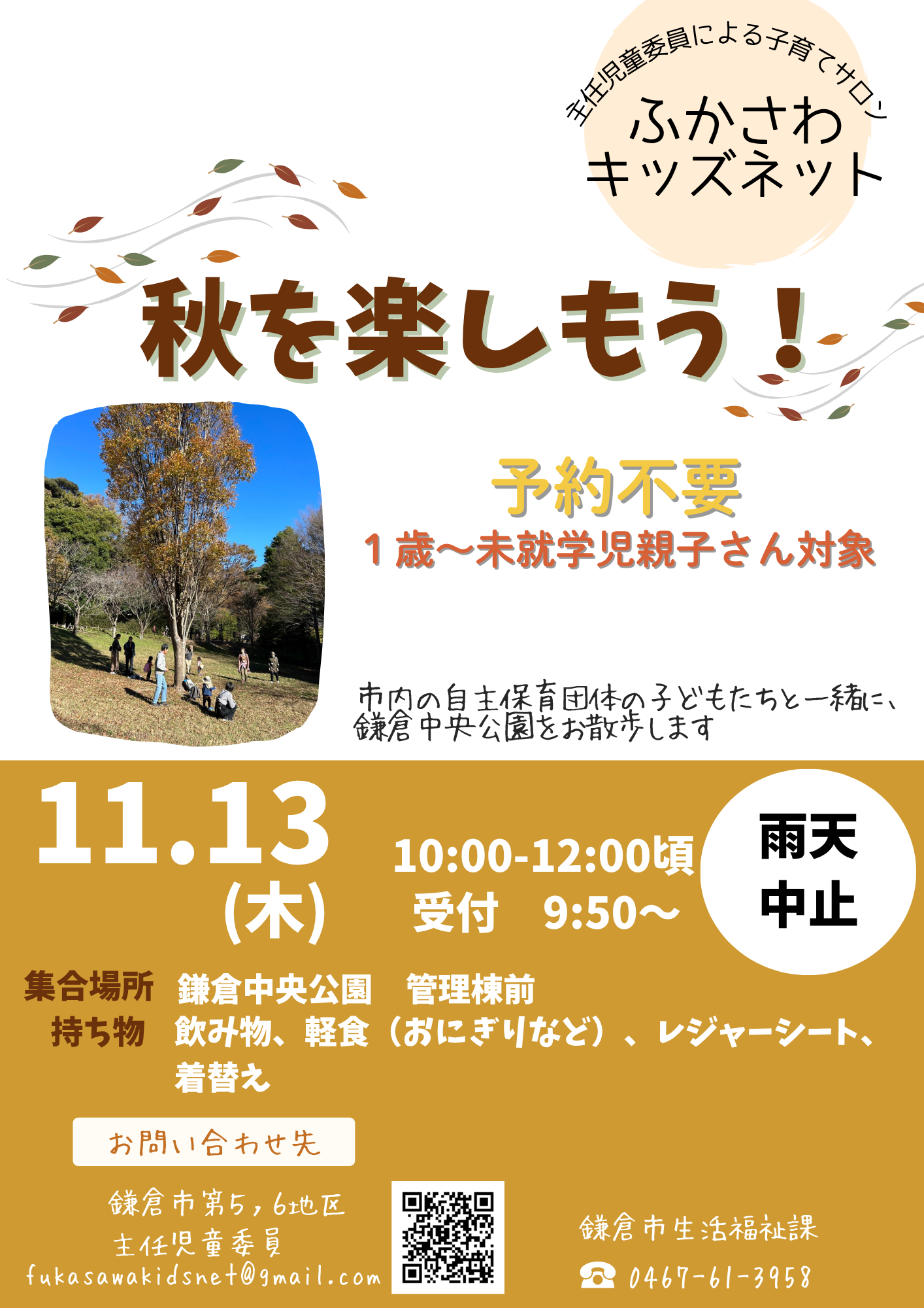 市内の自主保育団体の子どもたちと一緒に鎌倉中央公園をお散歩します。