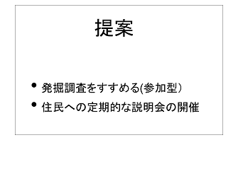 1つ目は、物的証拠の発掘のため、鎌倉時代の遺跡の発掘作業を進めること。その際、子どもや地域の方々が体験できるイベントを開催することで、住民同士の触れ合いや遺跡への愛着が湧くのではないかという提案。