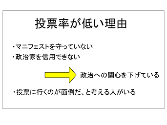 大きく分けて原因は2つあり、1つはマニフェストを守らない政治家がいるため、政治家を信じられなく投票できず、そのことが政治への関心の低迷につながっていること。もう1つは、投票に行くことが面倒であるということでした。